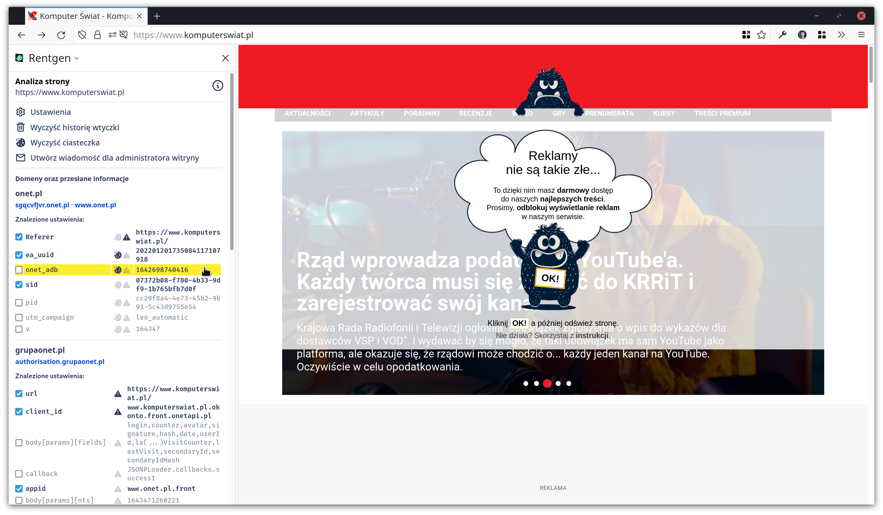 🇬🇧 Rentgen is a Firefox plug-in that automatically visualizes what data has been sent to third parties by the sites you visit. It allows you to generate a report or the content of an email that can be sent to the site administrator and/or the Office of Privacy and Data Protection. ⸺ 🇵🇱 Rentgen to wtyczka dla Firefoxa, która automatycznie wizualizuje, jakie dane zostały wysłane do podmiotów trzecich przez odwiedzane strony. Pozwala wygenerować raport lub treść maila, który można wysłać do administratora strony i/lub UODO.