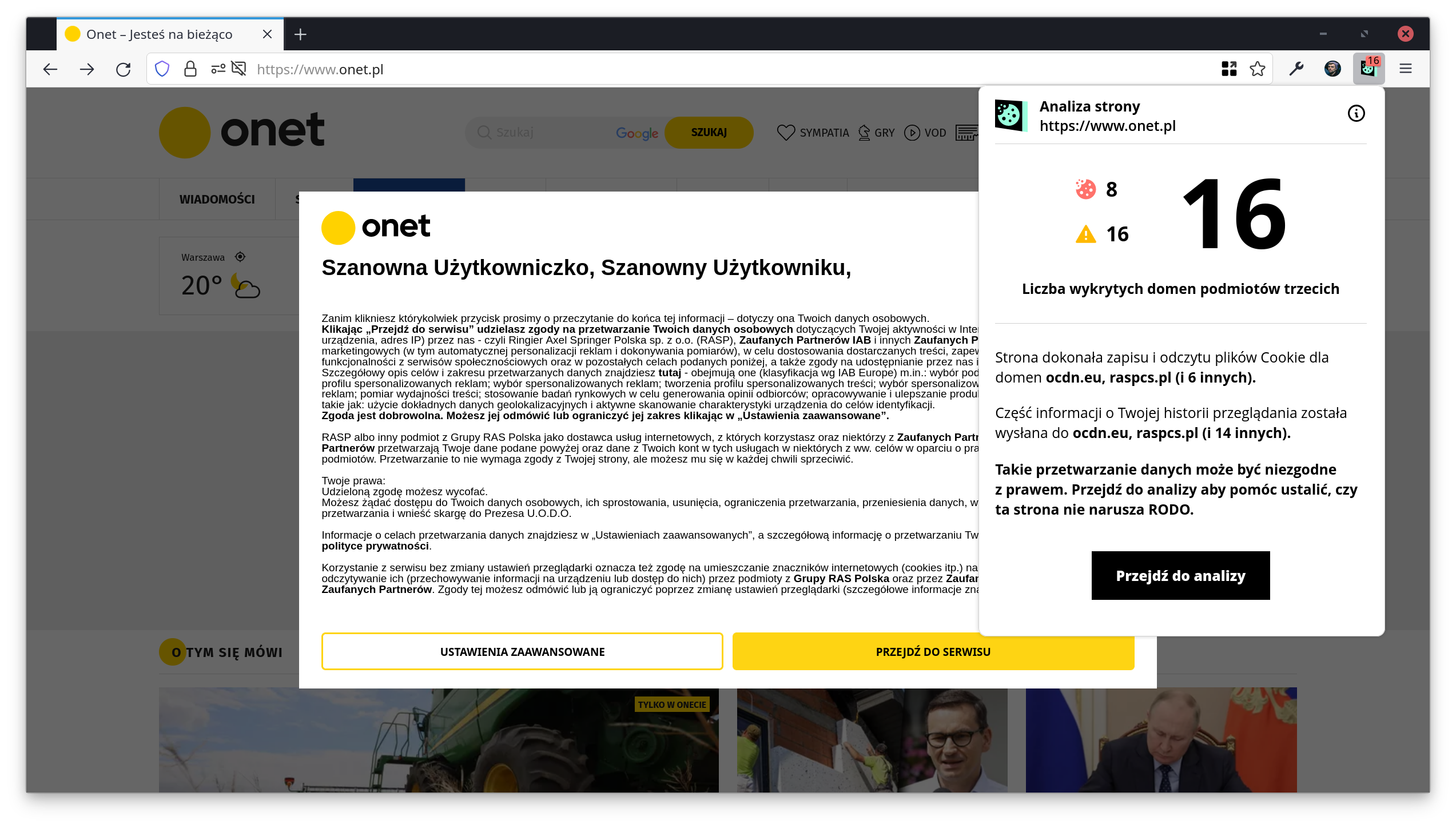 - wizualizacja danych przekazanych do podmiotów trzecich przez odwiedzaną stronę (historia przeglądania użytkownika oraz jego ciasteczka);